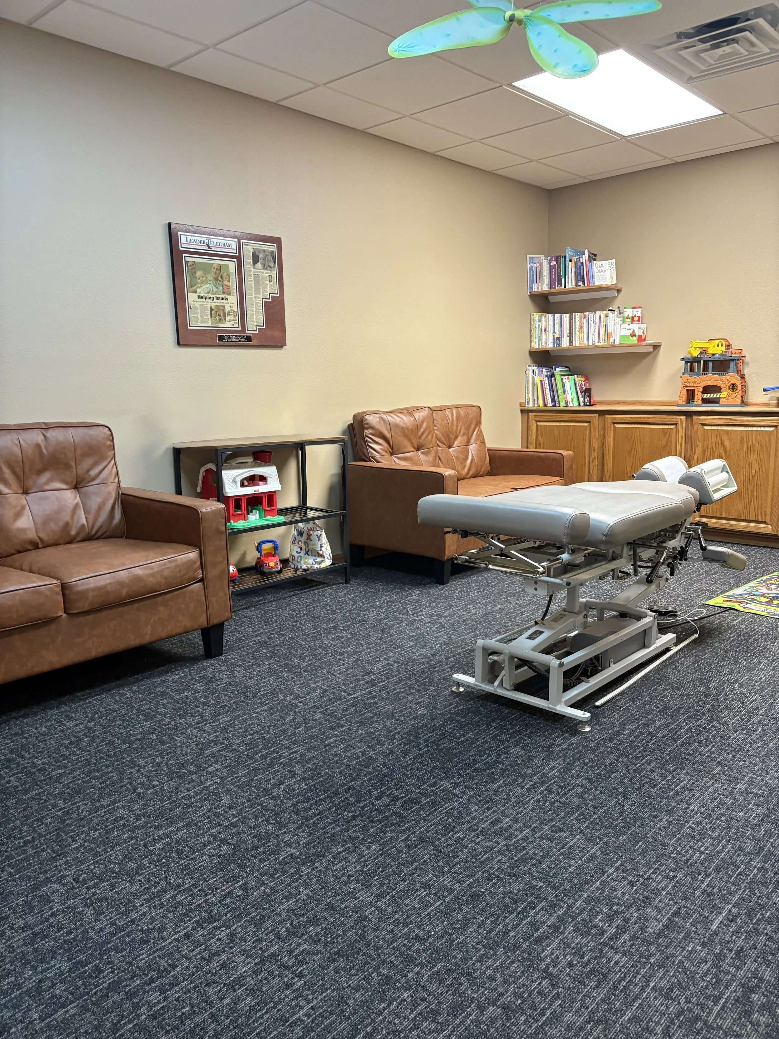 Our office is kid and family-friendly. We have two large family treatment rooms with plenty of toys for the kids to play with as each family member gets adjusted. Additionally, we have X-rays onsite and a Foot Leveler scanner for Custom Fit Orthotics.